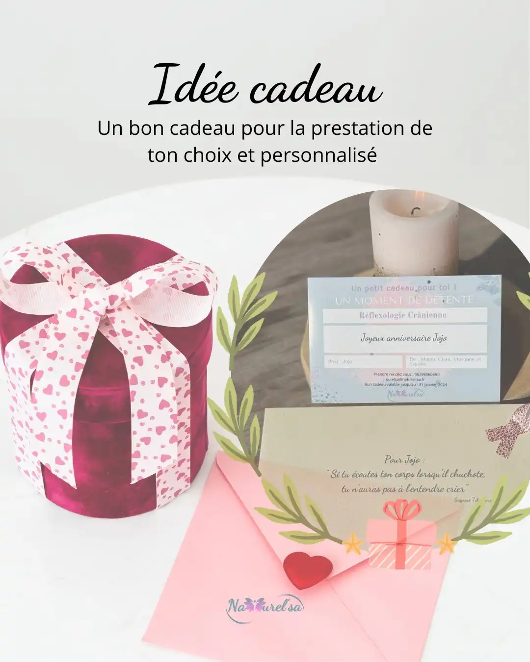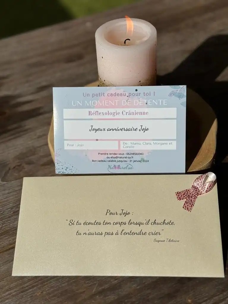 Avec les Bons Cadeaux Naturel’sa, vous permettez à vos proches de vivre une expérience unique, douce et profondément ressourçante. Un cadeau pensé pour prendre soin du corps, du cœur et de l’esprit, dans une ambiance cocooning et bienveillante.